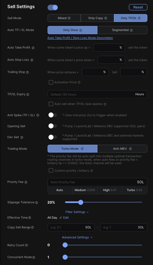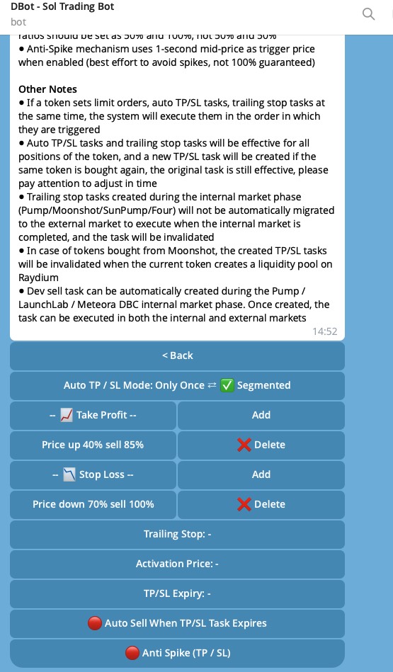 `If you click on Fast Buy/Sell and Copy Trading in TG and set the TP/SL tasks, it will only take effect on the current task. If you want to save the settings for all tasks, please save them in the template: /settings`