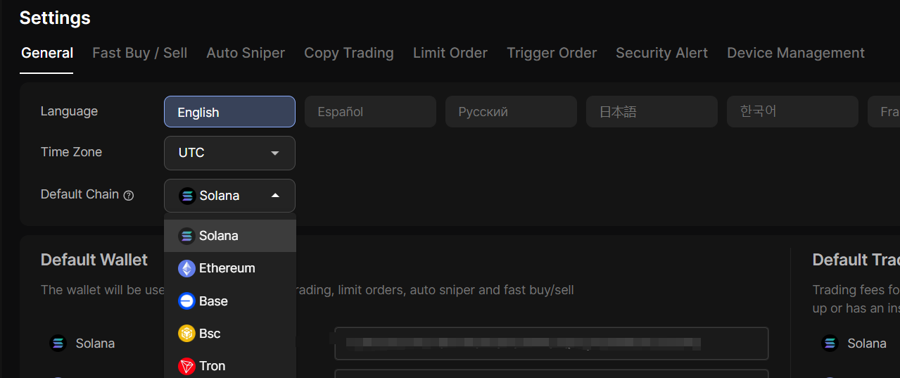 In the DBot Dashboard-Settings-[General](https://dbotx.com/dashboard/settings/general), you can select the default chain. This chain will be selected by default when creating a copy trading/limit order/sniper/fast buy/sell and PnL page.