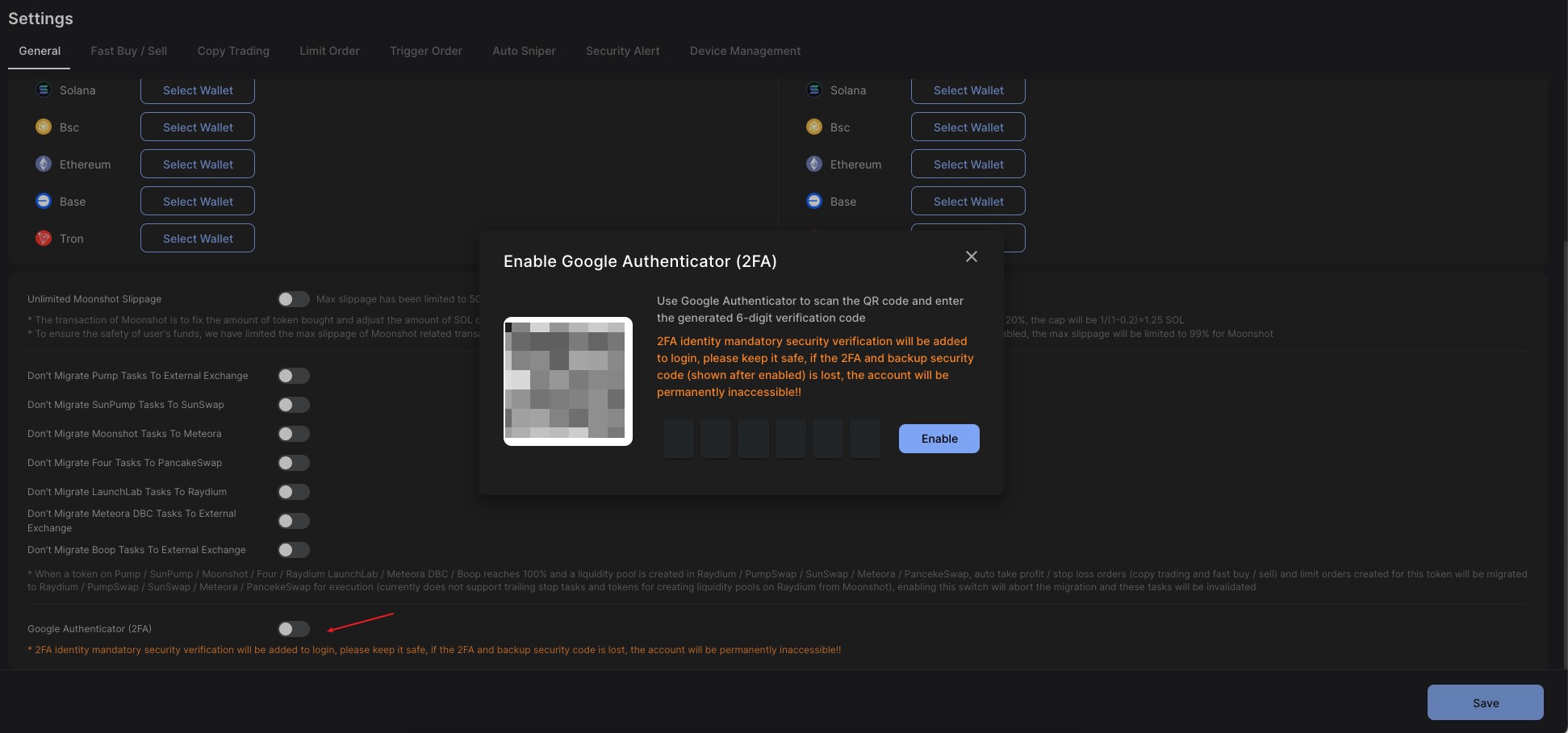 **In DBot Settings-**[**General**](https://dbotx.com/dashboard/settings/general)**, you can enable Google Authenticator (2FA)**&#x20;