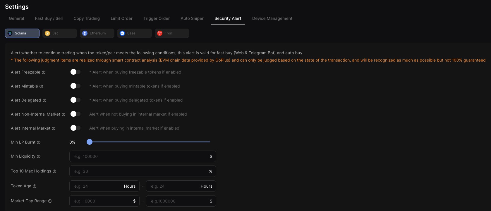 In DBot Dashboard-Settings-[Security ALert](https://dbotx.com/dashboard/settings/security), you can set alert whether to continue trading when the token/pair meets the following conditions, this alert is valid for fast buy (Web & Telegram Bot) and auto buy
