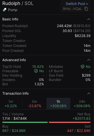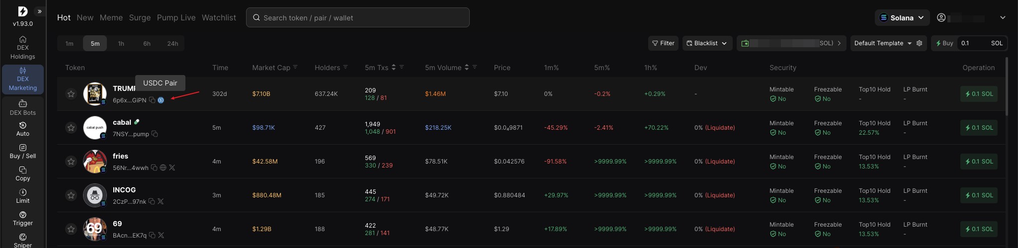 DEX type, CA, Pooled Token/Pooled SOL/Liquidity, 1m/5m/1h transaction volume ratio, token security test results (Mintable/Freezable/Top 10 hold/LP Burnt)
