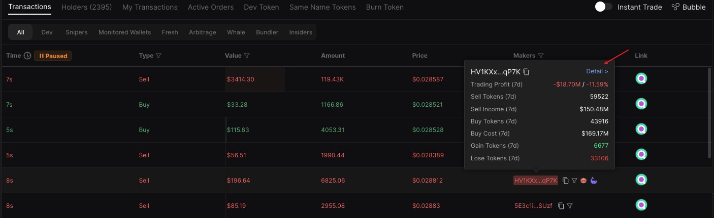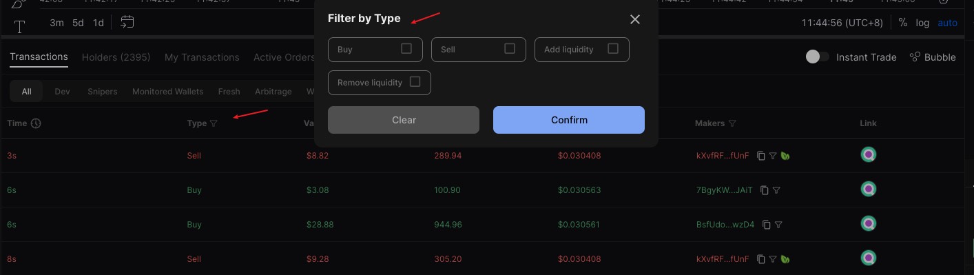 * &#x20;View Dev / Snipers / Monitored Wallets / Fresh / Arbitrage / Whale / Bundler / Insiders transactions and add / remove liquidity for real-time transactions supported. Multi-selection for real-time transaction types supported. Sorting by value for real-time transactions supported
