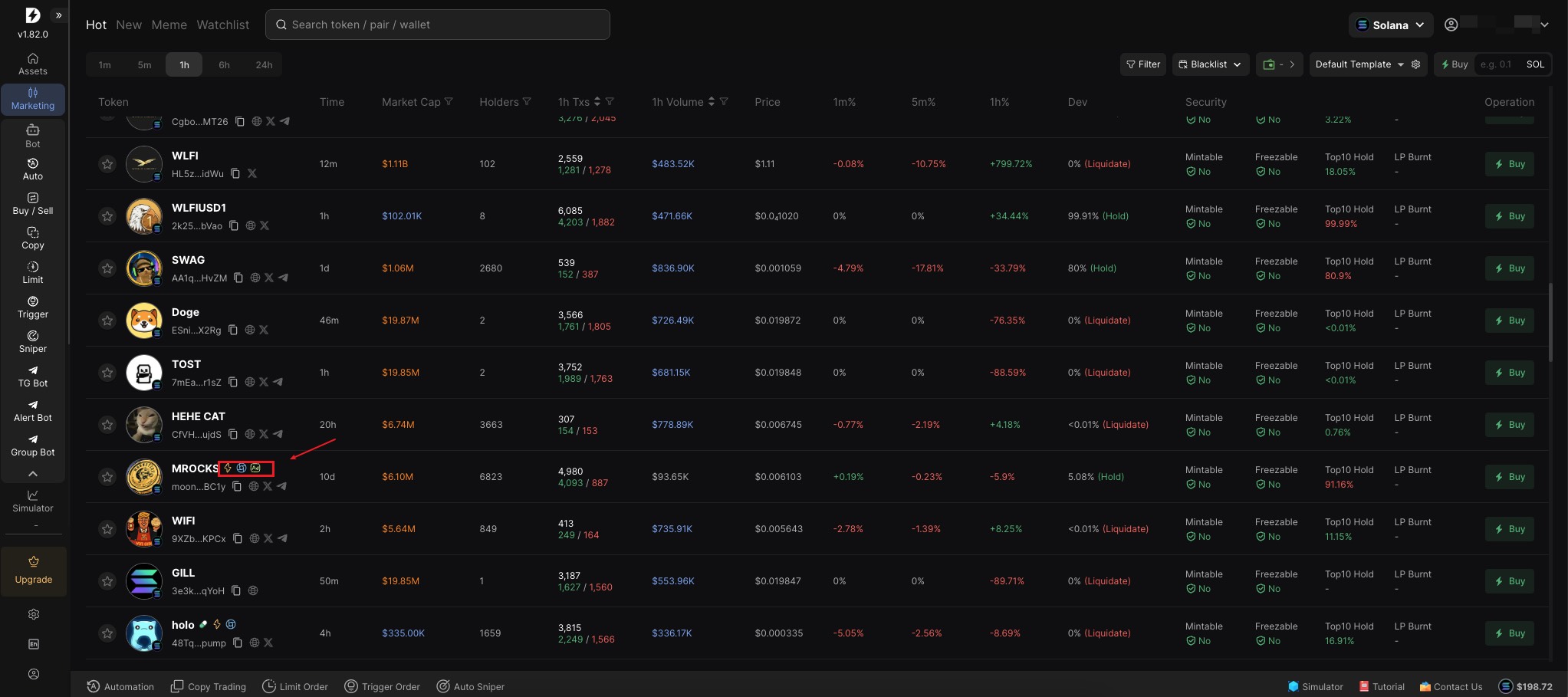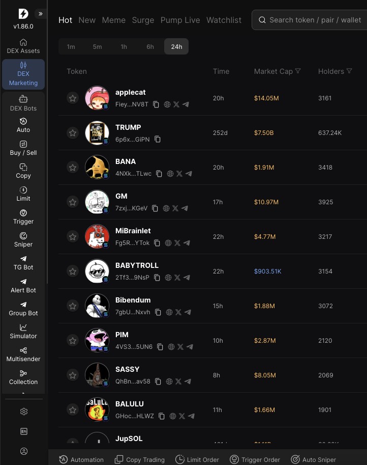 * **Hot:** By checking the 1m/5m/1h/24h time, current price and price percentage, analyze and filter out hot tokens that are suitable for your trading strategy (support adding to watchlist, copy CA, click to view K line)