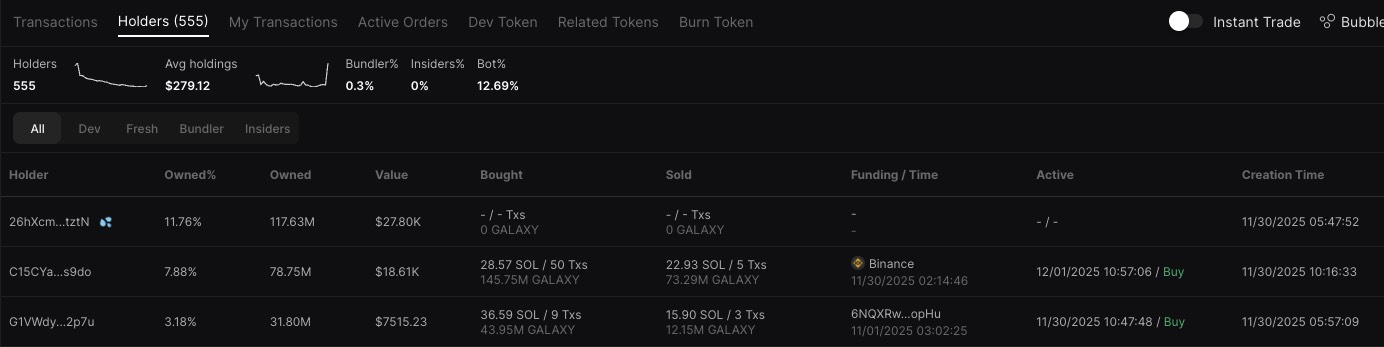 **Holders:** real-time display of Holder, Owned%, Owned, Value, Bought, Sold, Funding/Time, Active and Create Time. Liquidity pool tags for holders added. Real-time display changes in holders, average amount per person, Bundler%, Insiders%, Bot%