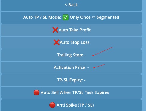 **Activation Price:** The trailing stop task will only be activated after the price increases beyond the specified value. For example, if the buy price is 100 and the activation price is set to 10%, it will only be activated when the price reaches 110. If the price rises to 105 and then falls, it will not be activated